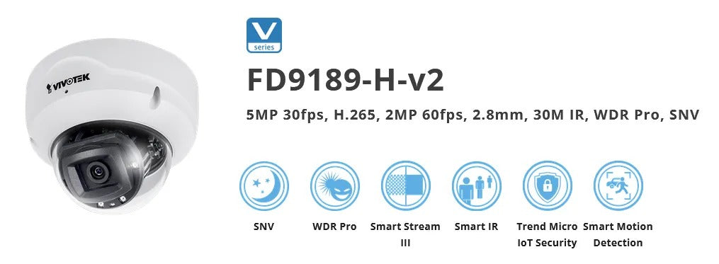 VIVOTEK’s FD9189-v2 series is a H.265 indoor dome network camera equipped with a 5-Megapixel sensor, enabling resolution of 2560×1920 at 30 fps. Featuring VIVOTEK SNV and WDR Pro technology, the FD9189-v2 series is capable of capturing high-quality imagery in both high-contrast and low-light environments.