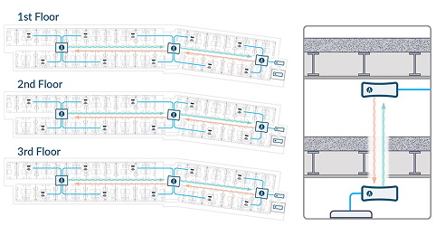 Connects across multiple floors, through ceilings, and even into parking structures.